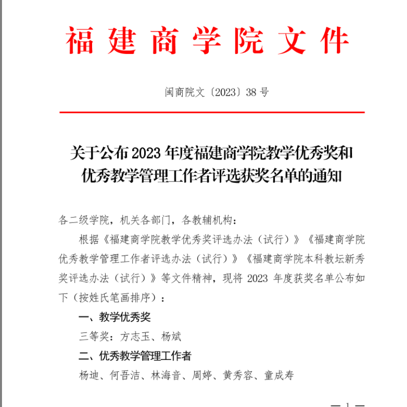 喜讯:开云周婷老师获得2023年度福建商学院优秀教学管理工作者荣誉称号