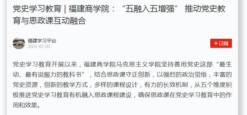 党史学习教育开展以来,福建商学院kaiyun开云官方网站坚持善用党史这部“最生动、最有说服力的教科书”,结合思政课守正创新,以强烈的政治觉悟,丰富的党史资源,创新的教学方式,多样的课程设计,有力的长效机制,从五个维度积极推进党史学习教育有机融入思政课程建设,确保思政课在党史学习教育中的作用和效果。