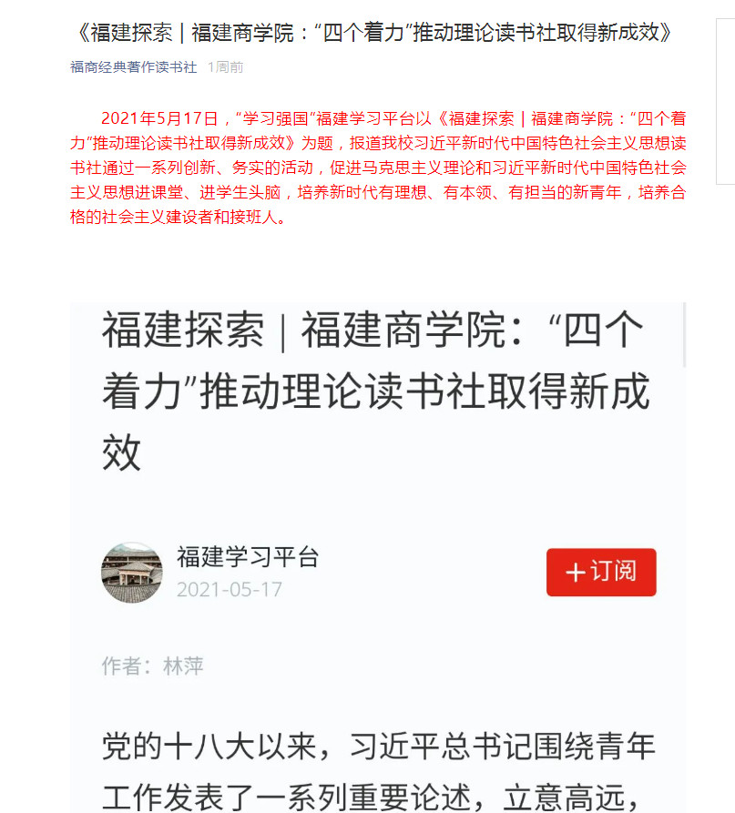 2021年5月17日,“学习强国”福建学习平台以《福建探索 | 福建商学院:“四个着力”推动理论读书社取得新成效》为题,报道开云习近平新时代中国特色社会主义思想读书社通过一系列创新、务实的活动,促进马克思主义理论和习近平新时代中国特色社会主义思想进课堂、进学生头脑,培养新时代有理想、有本领、有担当的新青年,培养合格的社会主义建设者和接班人。