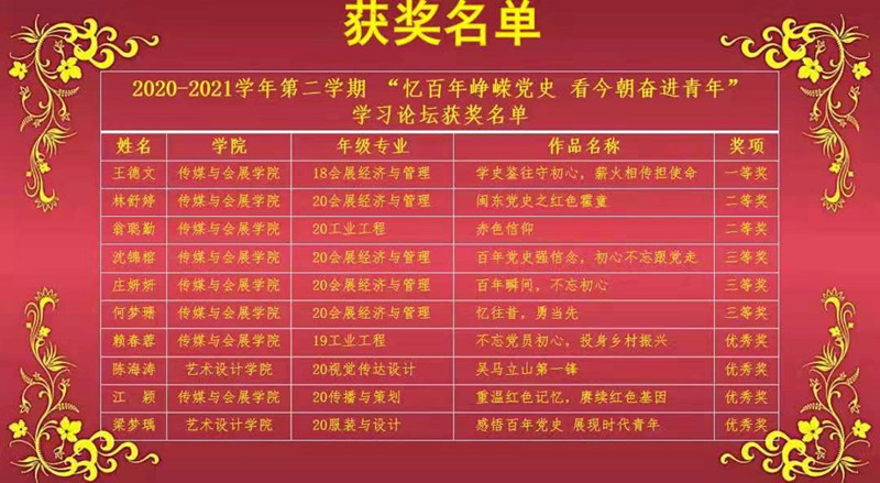 本次学习论坛以师生同台共话党史为形式,以“忆百年峥嵘党史 看今朝奋进青年”为主题,讲述自己的经历与党的故事,分享身边的优秀党员事迹以及党带领人民在革命、建设、改革历程中取得的伟大成就、经验启示等。活动过程中,kaiyun开云官方网站青年教师叶陈钦老师向在座的师生分享了抗日民主根据地开展“豆选”的历史故事,分析了“豆选”的民主价值以及民主启示;郑南希老师通过讲述宁夏闽宁镇几十年来在党的领导下以及闽宁人民共同努力下摆脱贫困的历史,阐释“闽宁模式”对推进共同富裕的宝贵启示;黄小勤老师通过讲述闽江学院无臂学生黄道亮的奋斗故事,引导青年要肩负历史使命,坚定前进信心,立大志、明大德、成大才、担大任,努力成为堪当民族复兴重任的时代新人。