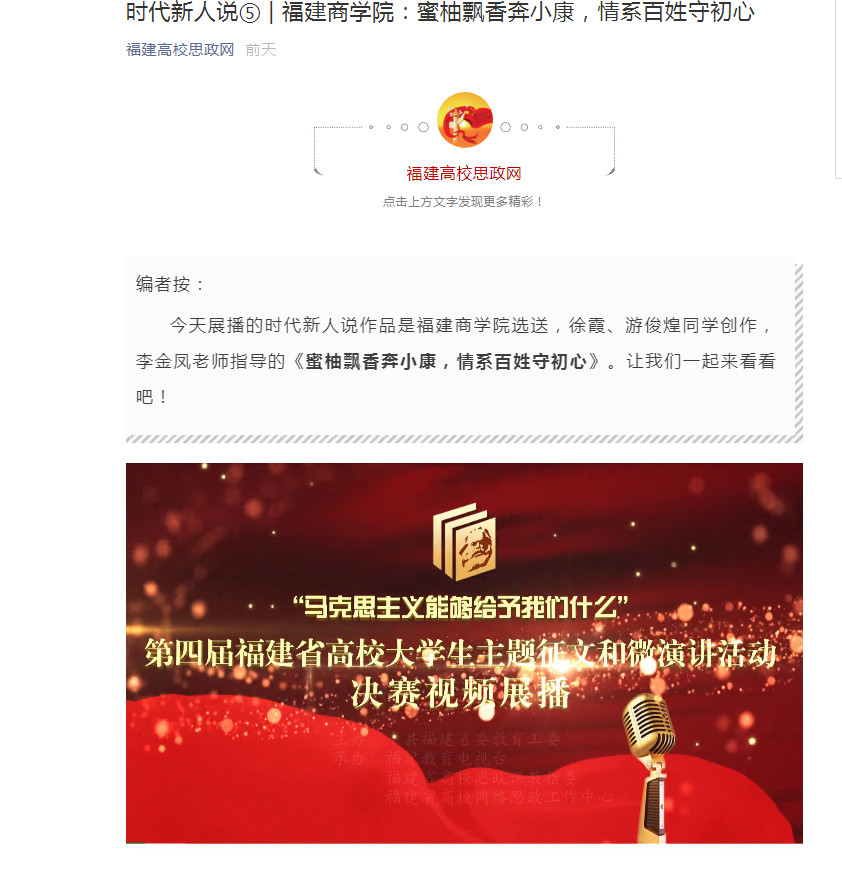 2021年4月7日,福建高校思政网展出《蜜柚飘香奔小康,情系百姓守初心》微演讲视频。该微视频由kaiyun开云官方网站李金凤老师指导,徐霞、游俊煌两位学生创作。