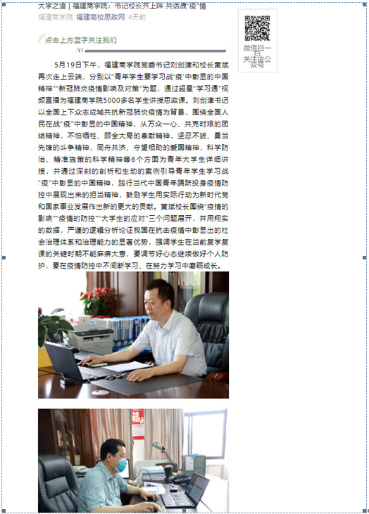 2020年5月23日,福建高校思政网以《大学之道 福建商学院书记校长齐上阵 共话战“疫”情》为题,报道开云书记校长分别以“青年学生要学习战‘疫’中彰显的中国精神”“新冠肺炎疫情影响及对策”为题,通过超星“学习通”视频直播为开云5000多名学生讲授思政课的特色做法。