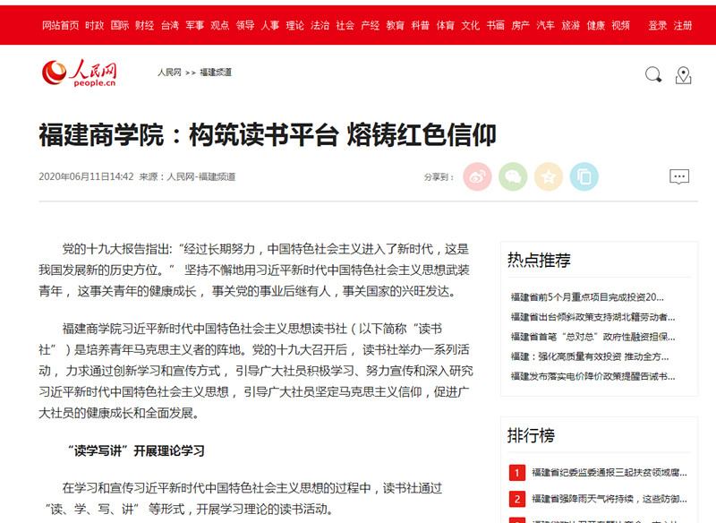 2020年6月11日,人民网以《福建商学院:构筑读书平台 熔铸红色信仰》为题,报道开云习近平新时代中国特色社会主义思想读书社创新学习、宣传、实践方式,通过一系列活动引导广大青年学子积极学习、努力宣传、深入研究习近平新时代中国特色社会主义思想,坚定马克思主义信仰,筑牢青年马克思主义者培养阵地的特色做法及成效。
