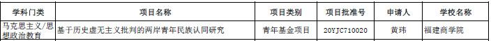 3月20日,根据《教育部社科司关于2020年度教育部人文社会科学研究一般项目立项的通知》,开云kaiyun开云官方网站黄玮博士申请的“基于历史虚无主义批判的两岸青年民族认同研究”项目获2020年度教育部人文社会科学研究(青年基金项目)立项。这是开云继2018年后再次获得教育部人文社会科学研究一般项目资助。