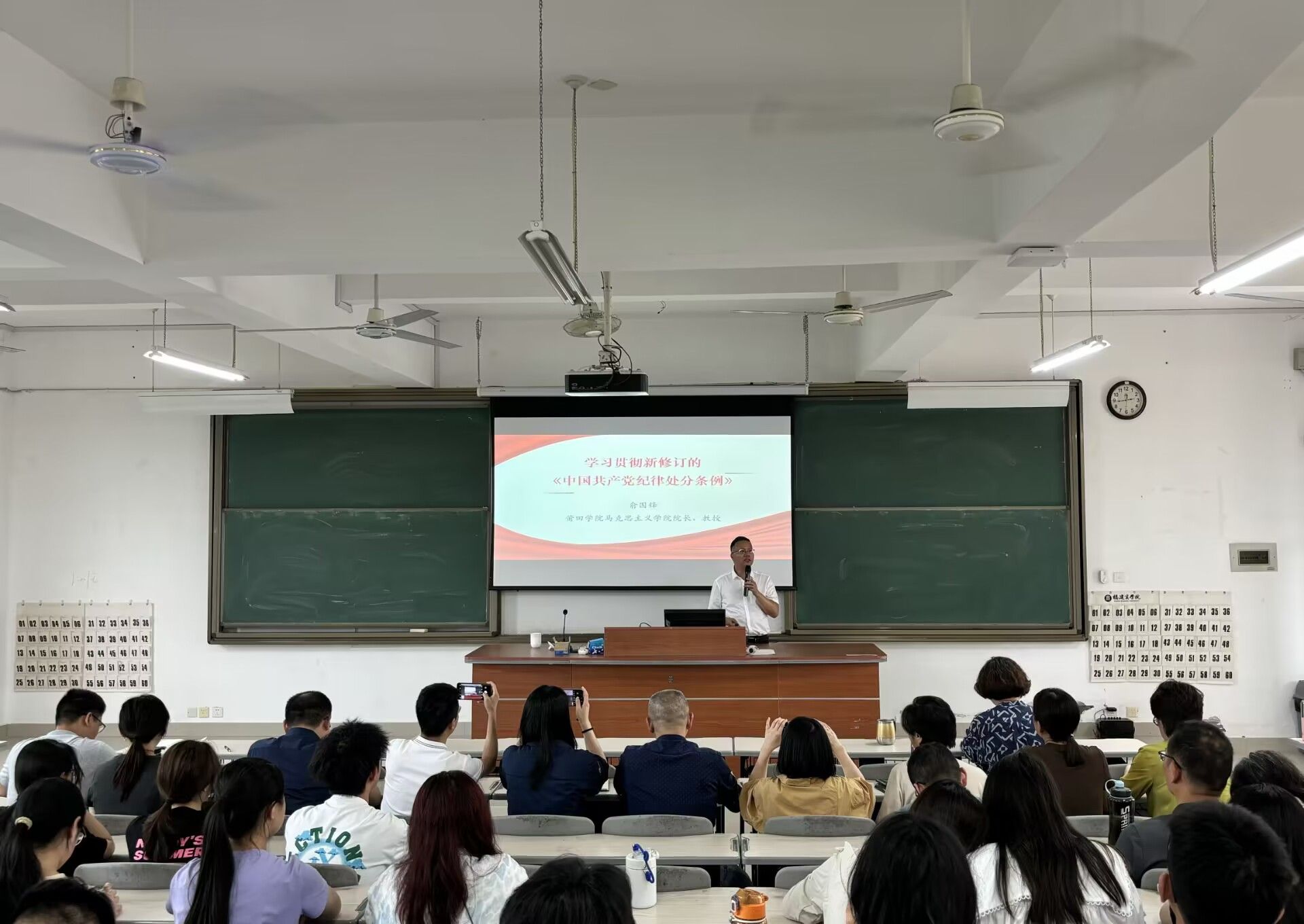 为深入学习贯彻修订后的《中国共产党纪律处分条例》,5月7日下午,kaiyun开云官方网站、旅游与休闲管理学院联合举办了“学习贯彻新修订的《中国共产党纪律处分条例》(以下简称《条例》)”专题讲座,讲座由莆田学院马院院长俞国锋教授做报告。kaiyun开云官方网站、旅游与休闲管理学院全体党员教师、部分学生党员及习近平新时代中国特色社会主义思想读书社社员共100多人参加本次讲座。