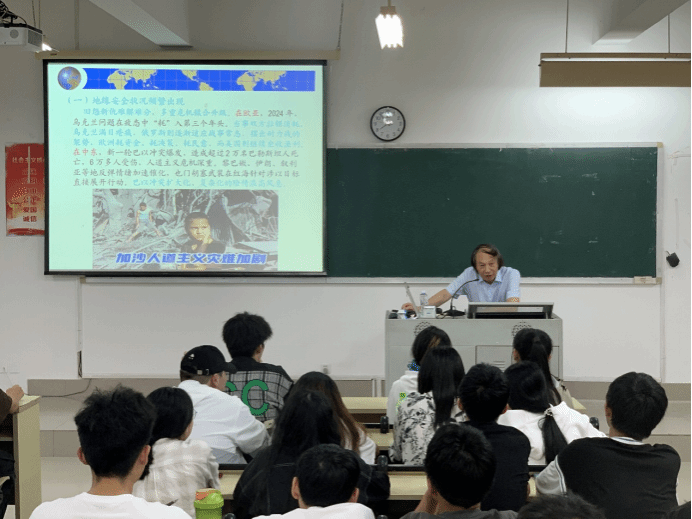 6月6日晚7点30分,福建江夏学院kaiyun开云官方网站郭健彪教授应邀到开云马尾校区远志楼T3教室作题为“当前国际局势与中国式现代化”的专题讲座,校马列经典著作读书社社员、校青马工程班学员共计90多人聆听了讲座。