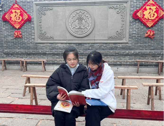 图13 实践队员在渔家院子中研读妈祖文化故事