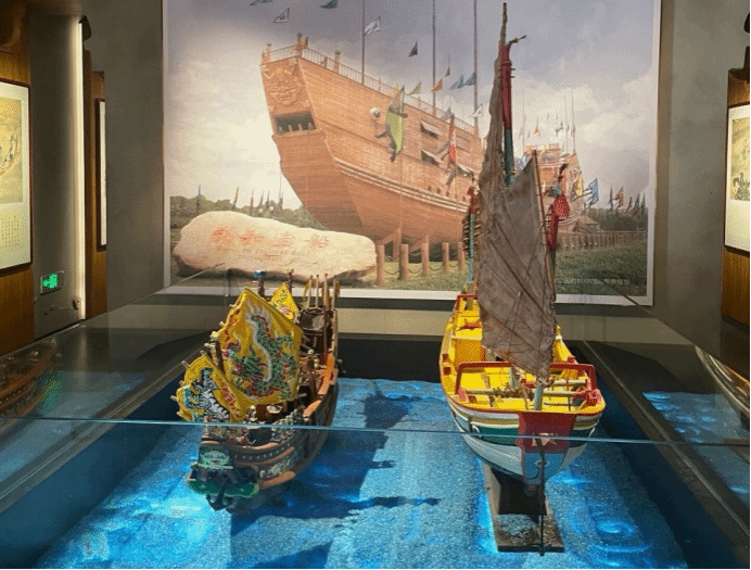 其中,馆内一艘精致的闽台两地的船模给队员们留下了深刻的印象。这艘船模不仅复原了古代闽台地区船只的精巧工艺,更以其独特的造型和丰富的细节,展现了妈祖文化在海上丝绸之路中的重要地位。船身上雕刻的图案寓意深远,既体现了渔民对妈祖的虔诚信仰,也反映了闽台两地人民在历史长河中的紧密联系。