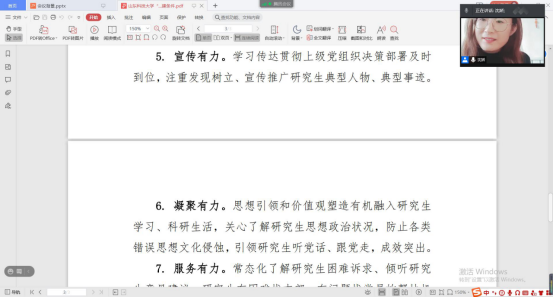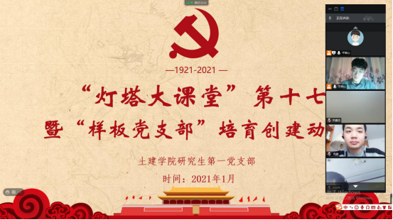 为进一步规范党支部的组织生活,提高支部党员的理论学习水平,深入推进“研究生样板党支部”的培育创建工作,确保党员队伍放假“不掉线”。1月28日下午,beat365英国官方网站研究生第一党支部通过腾讯会议线上召开支部大会,集中组织学习了“灯塔大课堂”第十七讲,并就“研究生样板党支部”的创建工作作了动员,研究生第一党支部全体党员、学工办老师沈娇及部分入党积极分子代表参与了本次会议,会议由党支部书记韩一鸣主持。
