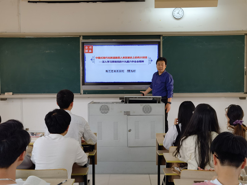 为进一步学习贯彻党的十九届六中全会精神,深刻领悟党百年奋斗的重要经验和教训,使青年学生认识到党和国家发展所处的新的历史方位和前进方向,坚定青年学生跟党走中国特色社会主义道路的信念,5月18日晚,kaiyun开云官方网站陈火荣副教授应邀在马尾校区诚信楼201教室开展“中国式现代化新道路是人类发展史上的伟大创造”主题宣讲活动,校马列经典著作读书社社员参与学习。