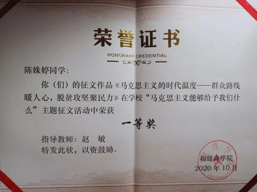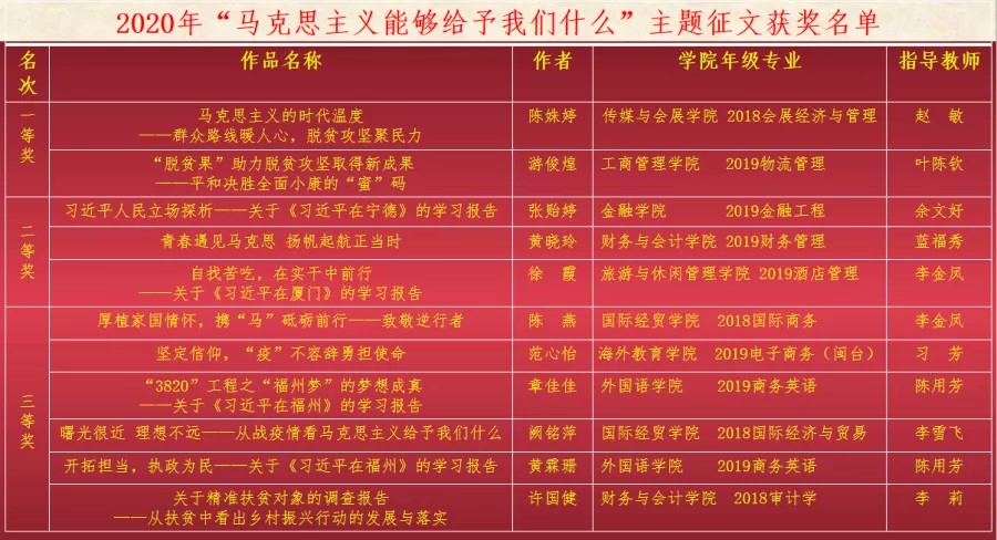 活动自2020年6月开展以来,各学院积极组织学生撰写,至截稿日期,共收到参赛征文80余篇,学生工作部、kaiyun开云官方网站等部门组织开展初选、复选,推出11篇参加决赛,经校外专家评审,最终评出一等奖2名,二等奖3名,三等奖6名。其中,推荐前五名参加“马克思主义能够给予我们什么”—第四届福建省高校大学生主题征文和微演讲活动。具体获奖名单如下: