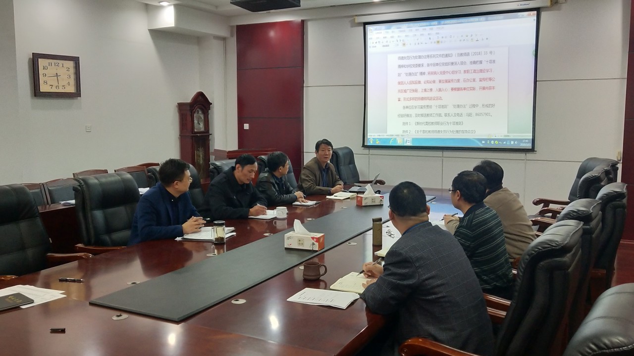 张东最后强调,党员干部一要带头践行遵守“十项准则”,规范职业行为,明确师德底线,做一名新时代的“四有”好老师;二要加强对“十项准则”和“处理办法”的宣传力度,通过形式多样的宣传形式,引导学院教职工深入领会和把握“十项准则”和“处理办法”精神;三要加强组织领导,明确责任分工,建立健全教师自我约束工作机制,坚决杜绝发生师德失范行为。