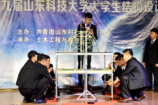 据悉,预赛由四十二支队伍参加,十一支队伍在冲破重重障碍后站到了决赛的舞台上。紧张而激烈的比赛在一段介绍参赛模型背后故事的视频后拉开序幕。首先是模型展示与模型介绍,模型介绍要求每支团队结合PPT进行2分钟的讲解,随后是评委提问。最激动人心的属结构加载环节,每一支队伍都选择不同的加载重量,加载时分为一级荷载、二级荷载和三级荷载。有些队伍在一级荷载时就遗憾失败,而个别队伍坚持到了三级荷载,成功完成了挑战。在决赛的舞台上每一个结构模型都给我们展示不同寻常的力量,观众们随着加载重量的增加而紧张,随着模型的坍塌而感到惋惜,当参赛队伍的模型成功完成了三级荷载时同学们由心地发出赞叹。在十一组模型比拼结束之后,王崇革副院长对本次活动做了最后的点评,他说道:此次比赛让我看到同学们的辛勤付出,十一个模型做得各有千秋。同学们能充分运用所学知识,这让我感到骄傲和自豪!