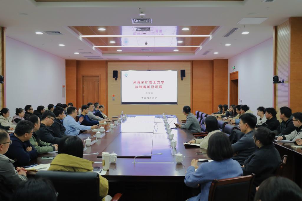 陈旭光教授围绕深海采矿岩土力学与装备前沿进展主题,作了一场精彩学术报告。他指出,在国家“双碳”战略背景下,深海采矿为未来可持续发展提供了重要能源支撑,对推动绿色能源转型具有重大的战略意义。同时,陈旭光教授针对履-土动态相互作用及平稳行走、射流-土耦合作用及高效射流采集、深海采矿低扰动-抑羽流方法及装备等关键问题的研究成果进行了详细的介绍。会上,针对海洋工程结构热点问题,陈旭光教授和团队青年教师、研究生进行了深入讨论,并给与了详细指导,对beat365海洋土木工程学科发展提出了建设性意见。此次报告交流会不仅为团队教师在海洋资源开发领域的研究提供了宝贵的建议和思路,也为师生打开了一扇了解前沿学术动态的窗口。