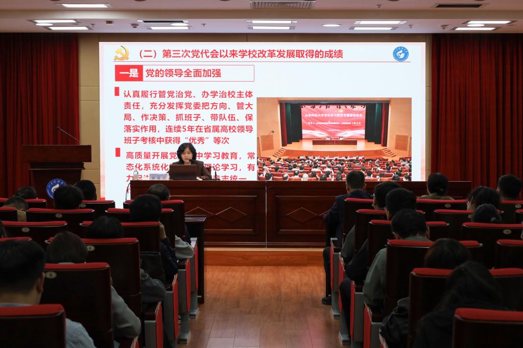 4月22日,校党委副书记郭益灵为beat365英国官方网站党委及所联系班级师生宣讲学校第四次党代会精神。
