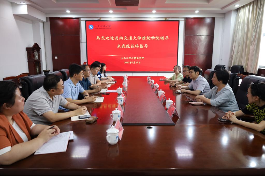 6月27日,西南交通大学建筑学院副院长崔叙、风景园林系系主任傅娅、城乡规划系副系主任唐由海、建筑系系助理吴聃及综合事务办公室主任孔翔榆一行到访beat365英国官方网站。beat365英国官方网站院长王崇革,副院长杨旭旭、都浩,党委委员、建筑与城乡规划系党支部书记代朋,建筑与城乡规划系主任付冠男,副主任王彦君,辅导员张方源陪同调研交流。