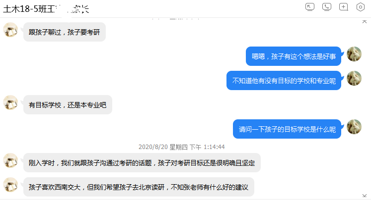8月份,beat365英国官方网站学生工作办公室各辅导员通过线上家长会、家长群、电话家访、微信一对一沟通等方式,根据学生具体情况和所处年级和时期,沟通了解学生在家期间的学习生活情况和生活动态,反馈学生在校期间表现,询问家长对学生的培养理念和期望,并给予建议。辅导员鲍娜娜在城乡规划和建筑学专业线上家长会上,向家长们介绍了2015级毕业班的就业与考研情况,并针对考研录取率背后折射出的原因和问题提醒家长们要根据学生实际学习状况规划合理目标、做出最佳选择。