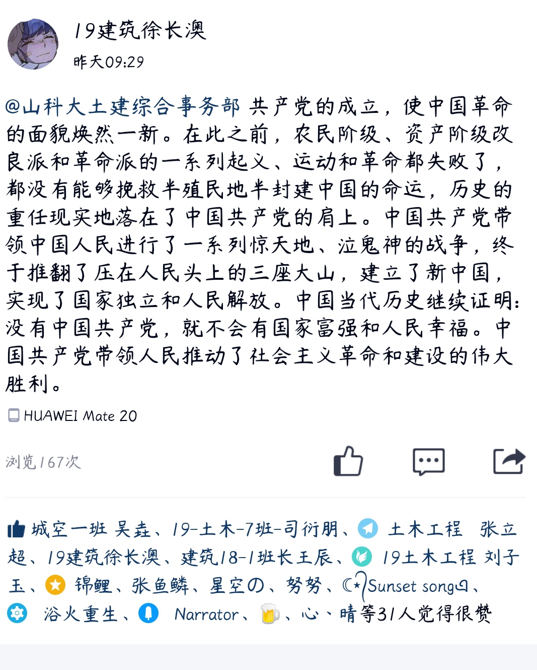 同学们通过发布空间日志抒发爱党爱国情怀、表明对党的坚决拥护。同学们有的是分享党史,有的是分享自己入党感言,有的是讲述中国共产党的光辉历程……中国共产党成立99年之际,土建学子的动态里满满红色正能量。beat365英国官方网站学生会主席曹峰源说:“砥砺复兴之志,这是一个古老民族生生不息的动力源泉;永葆赤子之心,这是一个人民政党薪火相传的制胜法宝。我愿为这样伟大的政党奋斗终身!”土木工程18-7班王江浩说:“功成不必在我,功成必定有我。身为一名社会主义建设者和接班人、一名入党积极分子,我将牢记初心和使命,砥砺前行,将奋斗之我融入中华民族伟大复兴的中国梦。”