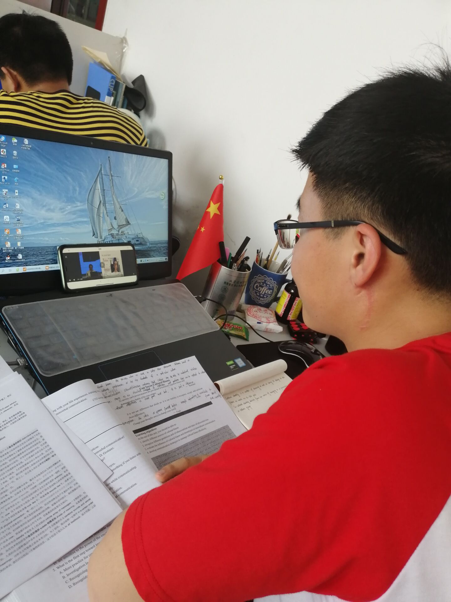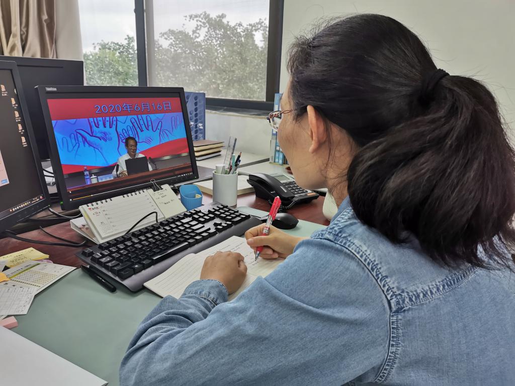 6月16日,beat365英国官方网站组织部分返校学生于J7-215教室收看校党委书记罗公利以“在战‘疫’中我们一起成长”为题的精彩思政课。学院全体学工干部、剩余返校学生、未返校学生均通过网络平台共上思政大课。