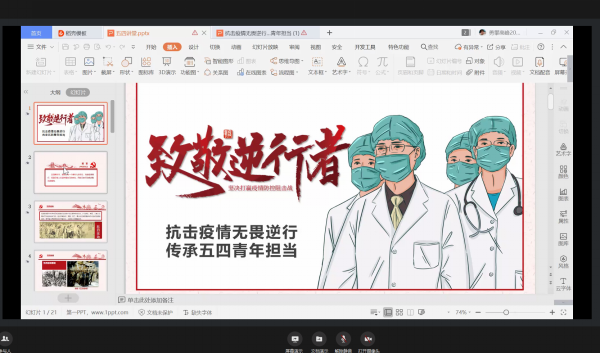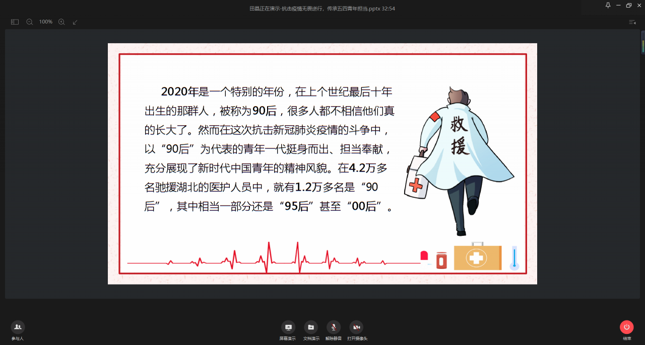 活动伊始,尚军对学院关于开展“青春心向党·建功新时代”五四主题团日活动进行了安排部署,带领同学们一起重温了习近平总书记给援鄂“90”后党员回信、以及对青年工作的重要论述,希望广大团员青年传承五四精神,积极践行习近平新时代中国特色社会主义思想,牢记时代赋予的职责使命。林琪琪为同学们讲解了五四运动的相关历史以及五四爱国主义精神的内涵。通过观看武汉医护剪辑纪录片,同学们纷纷为医护逆行者们用自己的实际行动诠释五四爱国精神的做法点赞。随后,田晶又向同学们具体剖析了在疫情中那一个个感人的九零后故事,进一步引导同学们对五四精神的反思。