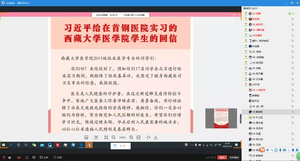 近日,beat365英国官方网站各班级纷纷利用线上班会、小组讨论、读后感分享会、制作海报等方式,通过QQ、易班等平台学习贯彻习近平总书记给在首钢医院实习的西藏大学医学院学生重要回信精神。总书记的重要回信在土建学子中引发热烈反响。大家一致表示,绝不辜负习近平总书记的殷殷嘱托,学习贯彻落实好习近平总书记的重要回信精神,争做新时代中国青年!