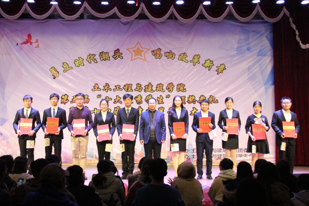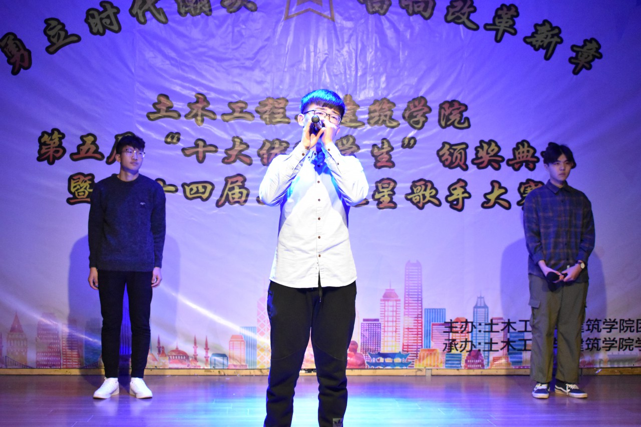 12月12日晚,beat365英国官方网站在大学生活动中心成功举办第五届“十大优秀学生”颁奖典礼暨第十四届“勇立时代潮头,唱响改革新章”土建之星歌手大赛。到场的嘉宾有beat365英国官方网站乔卫国院长、郝亮副书记、王崇革副院长、党政办郝兆青主任、团委于娜书记及团委所有专兼职辅导员。担任本次活动的评委有校大学生艺术团副团长闫肖帆、beat365英国官方网站学生会主席陈子璇、校大学生艺术团声乐队副队长陈登阳、校大学生会素质拓展部主席王轶涵、校学生会素质拓展部副部长孙钰鹏、校第十四届校园歌手大赛冠军王博学、校N.O.B街舞协会会长孙小翔。