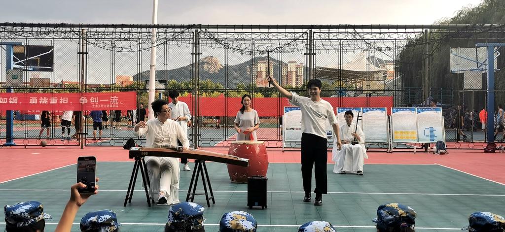 快闪现场,学生们以古筝、竹笛、二胡、中国鼓四种极具中国特色的传统乐器演奏出《九州同》,古风韵韵,指尖萦绕。不同的乐器有着不同的曲调,抑或舒缓悠扬,抑或激动起伏,吸引了新生们的注意力,点燃了全场的热情。
