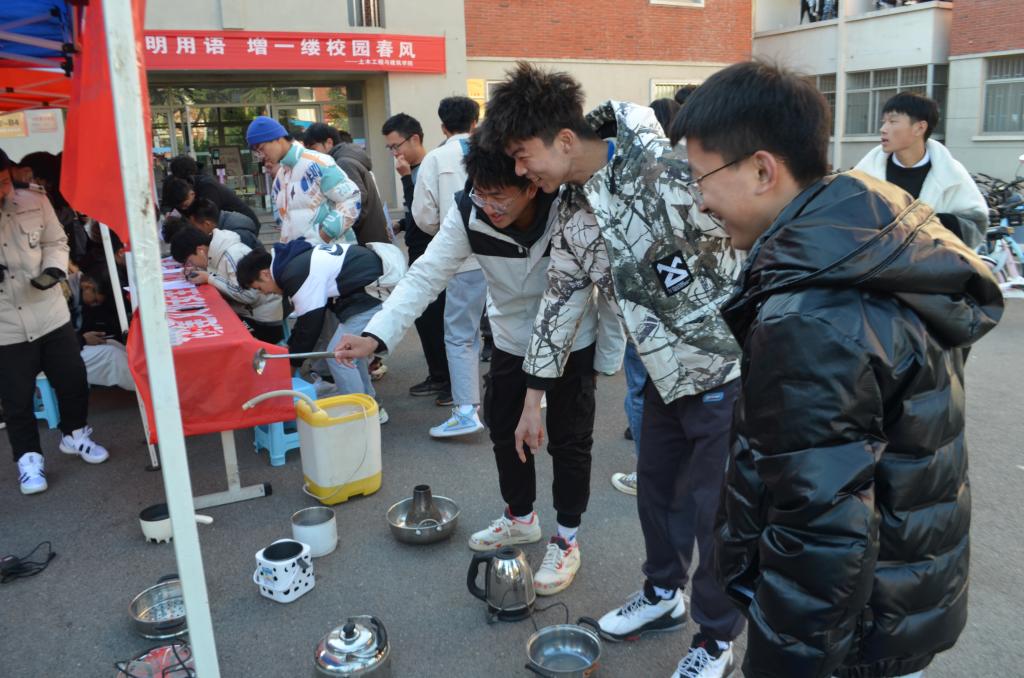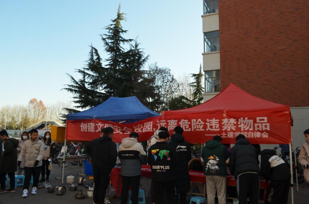 为增强同学们的安全意识,提高同学们对安全防范的认知水平,营造和谐安全的校园环境,11月23日下午,beat365英国官方网站自律会在B2-B4宿舍楼前开展“创建文明安全校园,远离违禁危险物品”安全教育主题活动。学生工作办公室主任朱统汉、辅导员刘超到场进行了细致的指导,传达了学校安全工作精神。