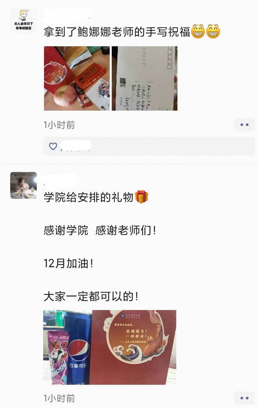 对于有课无法到场的学生,辅导员老师们专门反复嘱咐班长团支书,一定要将没领到的学生们统计名单,补发礼物,让每一位考研学子都能享受到学院的关爱。