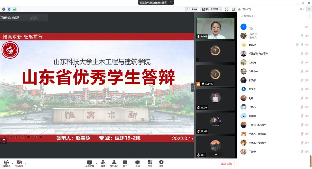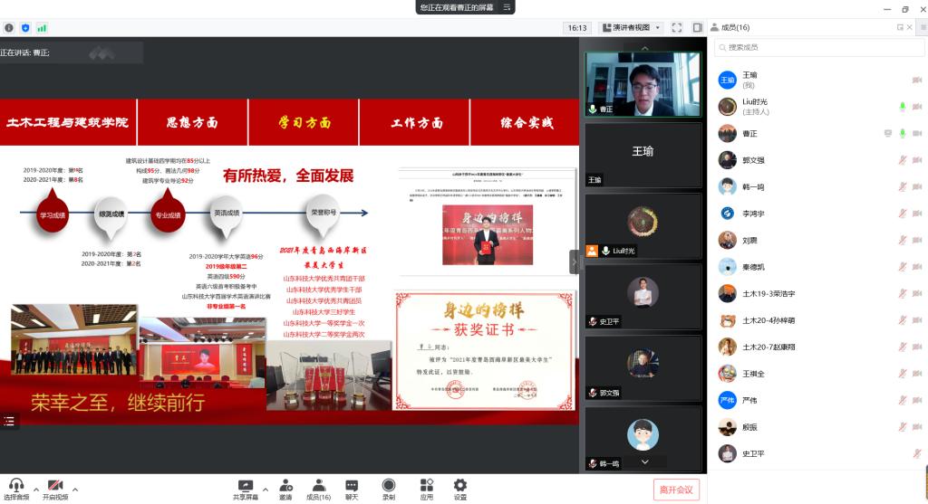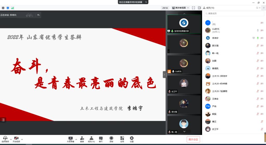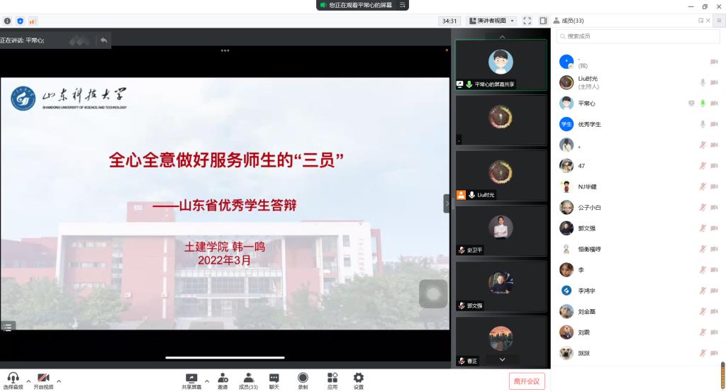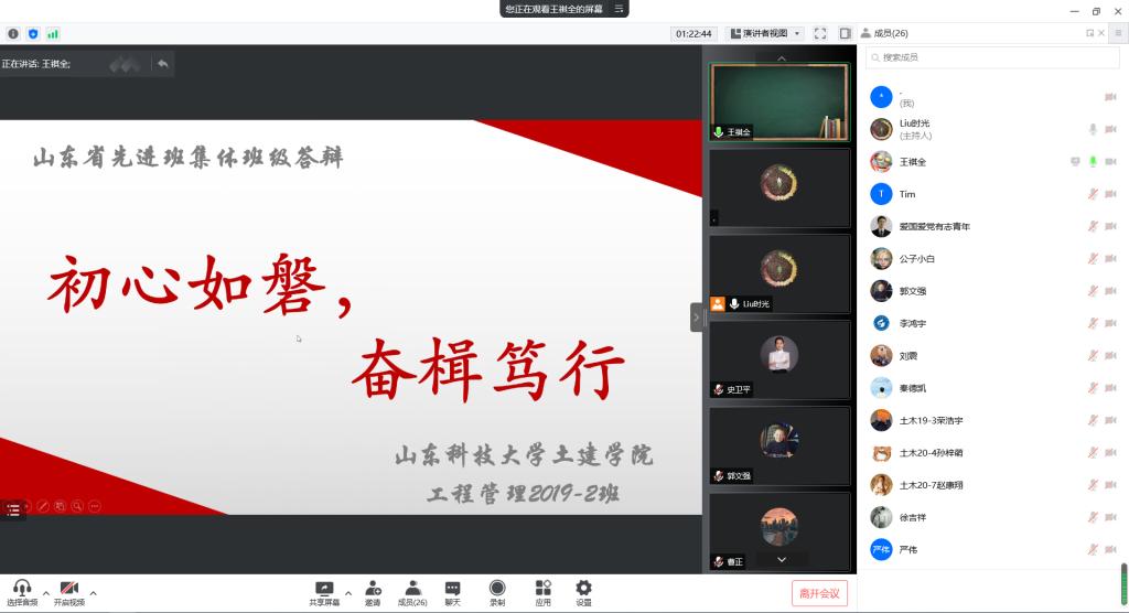 为充分发挥榜样力量、展现学院学生风采,激励同学们自强不息、奋斗成才,beat365英国官方网站举办“山东省高等学校优秀学生、优秀学生干部、先进班集体”评选答辩会。鉴于疫情影响,团委创新形式,借助“腾讯会议”网上平台进行线上答辩。学院党委副书记高静、团委书记朱统汉、全体辅导员、班主任及部分学生代表参加答辩会并担任评委。