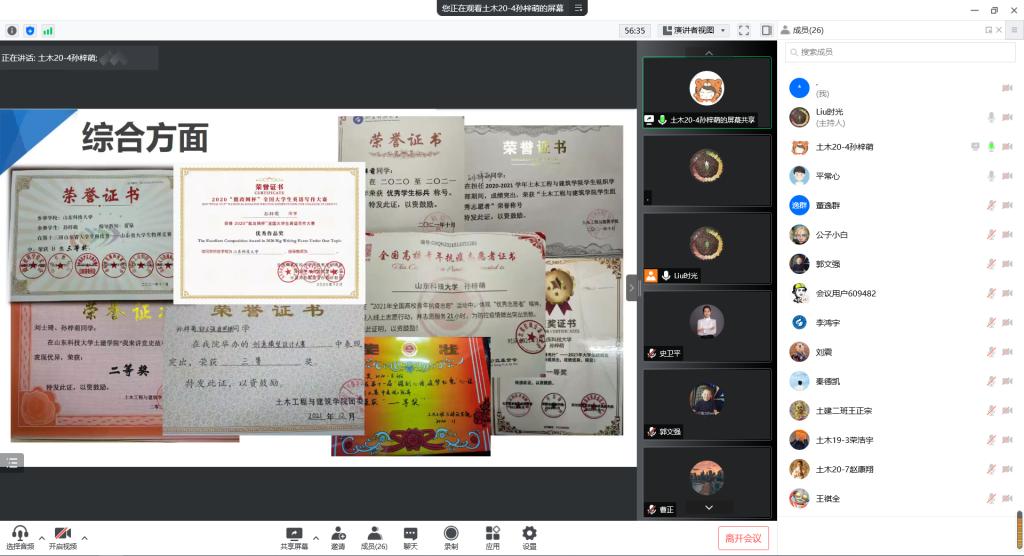 经过前期自主申请、初步评比筛选,共有13名本硕学生进入答辩环节。他们从思想动态、学习状况、学生组织工作、科研创新、社会实践和对未来的展望等多个方面全方位、多层次地展现自己。稳居前列的学习成绩、优异的科研成果、丰富的志愿服务和社会实践经历……答辩过程中,候选人自信大方,4分钟的答辩既展示了自己取得的成绩,又分享了奋斗史上的心路历程和感悟收获,让评委老师和同学们充分看到了他们身上的发光点,感受到他们一路走来披荆斩棘的坚持。紧接着进行的是优秀班集体的答辩,答辩人就班级特色制度、班级团日活动、班级学风建设等多个方面详细具体的介绍了班级的优秀氛围与成果,获得老师和同学们的一致好评。