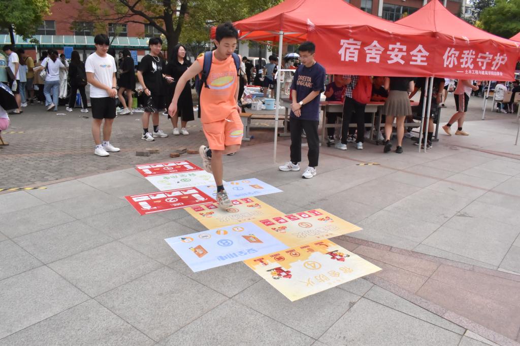 本次活动寓教于乐,以“跳房子”游戏为载体,吸引了广大学生的积极参与。参与活动的学生跳到石子投入的格子后折返,然后根据格子对应数字寻找工作人员进行相应的安全知识问答、安全知识了解或灭火器使用演示观看。活动过程中,志愿者还通过发放宣传页、填写问卷调查等形式,结合校园火灾典型案例,采用通俗易懂的语言,为学生重点讲解了宿舍常见火灾隐患,宿舍楼火灾逃生技巧以及报警注意事项等消防安全常识,并就同学们提出的消防安全隐患整治以及责任制落实和制度建设等各种有关宿舍安全的问题进行了耐心细致的解答,取得了良好的宣传教育效果。安全无小事,生命至上,同学们表示,将共同维护宿舍安全,学习宿舍消防安全知识,做生命的守护者。