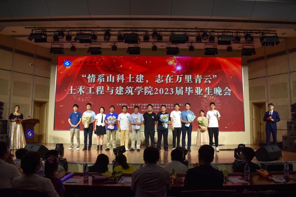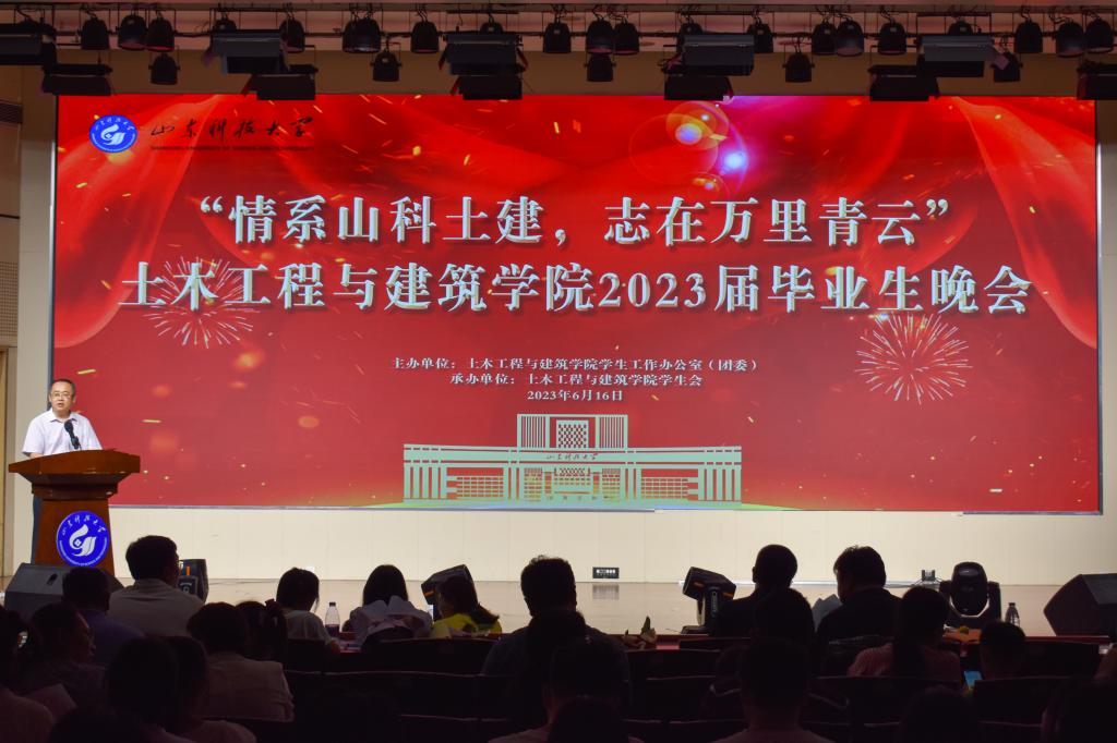 依依惜别母校,轻轻诉说离别,情系山科土建,志在万里青云。6月16日,beat365英国官方网站2023届毕业生晚会在大学生活动中心隆重举行。beat365英国官方网站党委书记宋西路,院长王崇革,学院党委副书记高静,副院长李朋、都浩、李为腾,学院2023年“我最难忘的恩师”代表、各系主任、教师代表和全体辅导员出席晚会,一同欢送2023届毕业生。