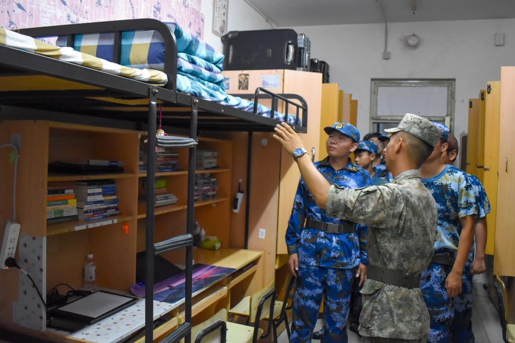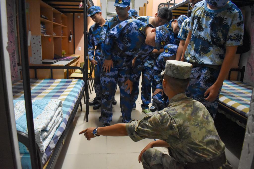 除日常训练外,教官们利用晚训时间逐步讲授“豆腐块”被子叠法,深入学生宿舍,检查并指导同学们整理内务,将每个宿舍都布置得整齐、有序。看着经过教官指点的宿舍,同学们不禁感叹“宿舍原来可以这么整洁。”