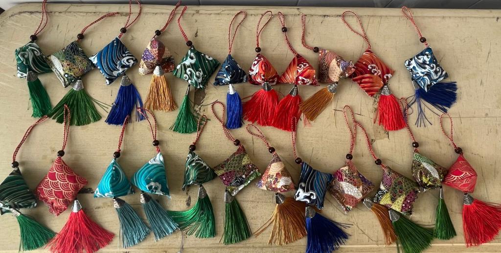 学生们在活动中尽情地展现自己的想法,将香草装入布袋内,根据各自的想法进行香囊的制作。从装填香料到穿针引线,学生们全身心的投入参与香囊的制作,无不展现他们的奇思妙想。在活动中,参与者相互合作,遇到制作问题就相互虚心求教,在合作中完成了各自的作品,做出了各形各色的香囊,展示了学生们的优秀的审美素养。