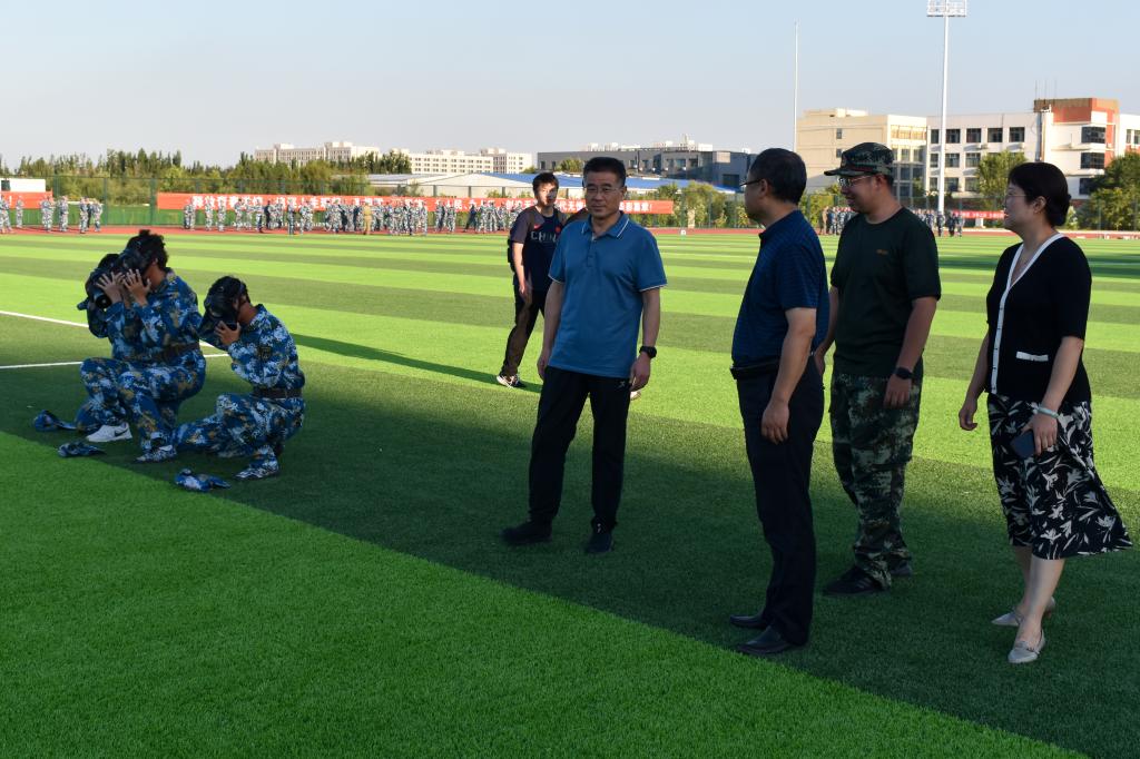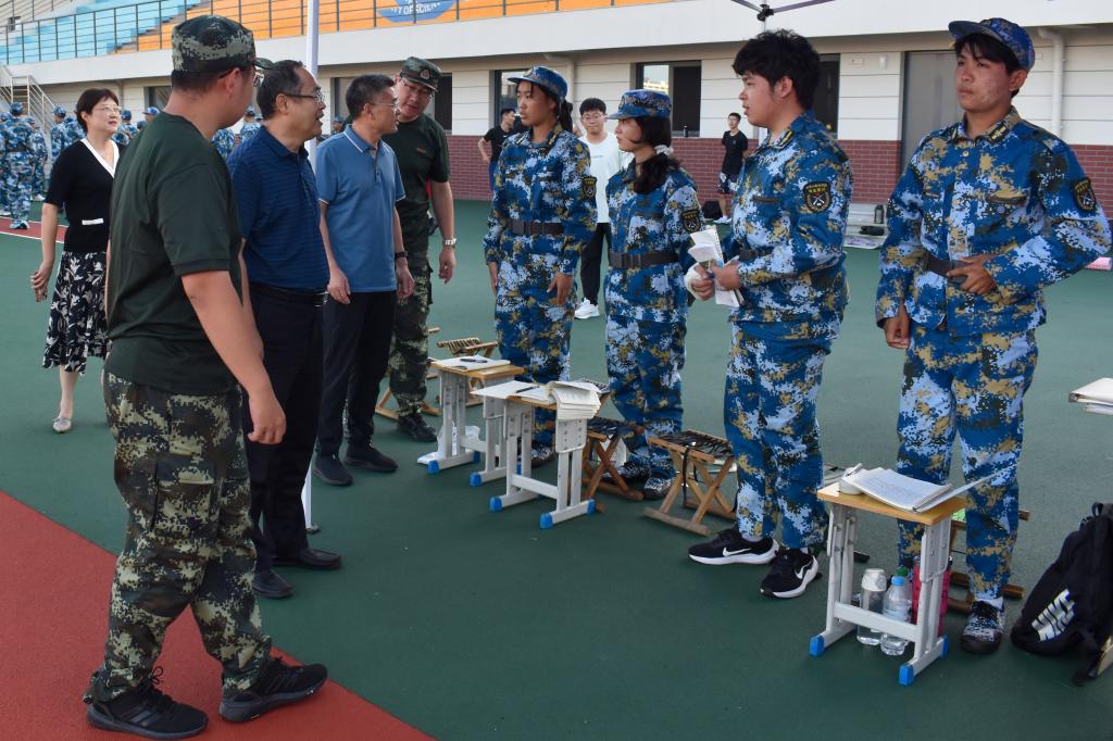 下午,学院党委书记宋西路、院长王崇革带队领导班子慰问军训学员,深入了解学生军训情况。宋西路肯定了同学们辛苦训练取得的优秀成果,对军训教官在本次军训工作中的辛苦付出表示赞许。同时,他还希望同学们将军训中磨练出的优良品质和饱满的精神状态延续到以后的学习、工作和生活中。在伤病连的休息区域,王崇革与同学们亲切地交流,耐心询问了同学们目前的身体情况。