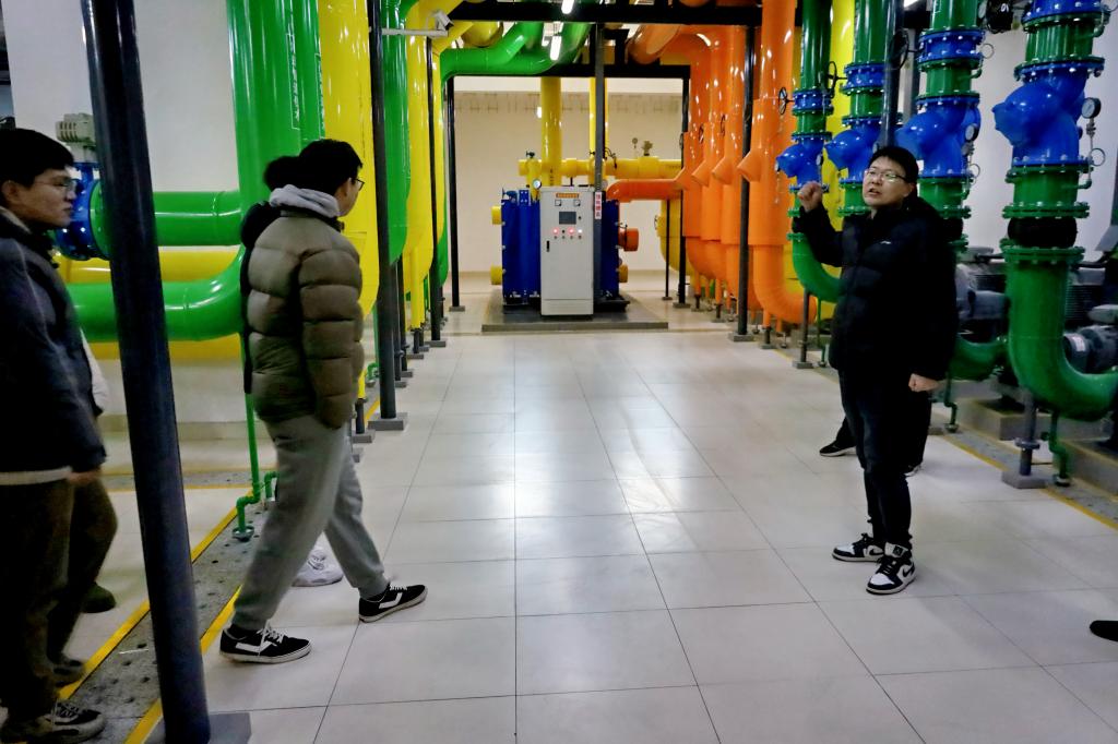 孙清典首先带领同学们来到学校供水供热泵房,详细介绍了学校站点分布、耗电、供暖及供水情况,并深入讲解了供水回水设备、水罐仪器设备及其供水原理,让同学们对校园基础能源供应设施有了直观的认识。随后,在韩庆防的带领下,同学们来到图书馆地下室,同学们参观了消防泵房、变配电室等设施,还了解到地下停车场雨棚、保温管道的材料使用细节,进一步拓宽了同学们的专业视野。最后,全体人员聚集在校东门建设施工现场,刘志强为同学们讲解了工地工程勘测、开挖、打桩、验收等施工顺序,强调了依据国家规范施工的重要性,使同学们对建筑施工流程有了清晰的认知。
