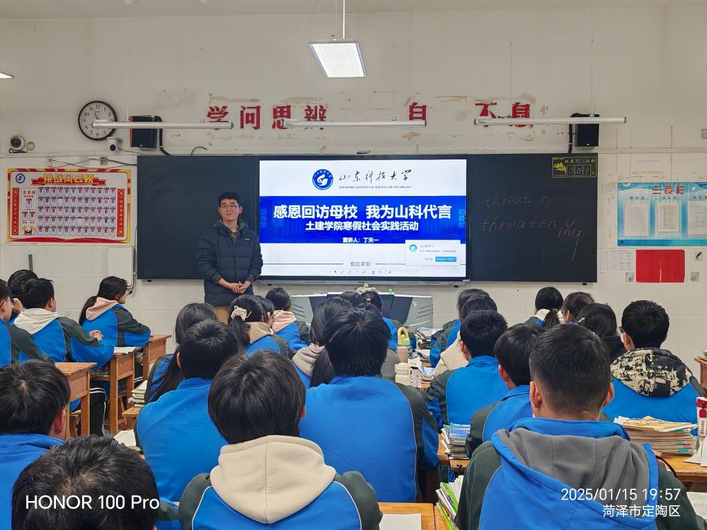 活动期间,同学们怀揣着对beat365英国官方网站的热爱与自豪回到高中母校,迫不及待地向学弟学妹们宣传beat365英国官方网站以及beat365英国官方网站的相关情况。在济宁市泗水一中,来自beat365英国官方网站土木工程专业2024级4班的孔明哲同学凭借精心准备的宣传资料,以及对beat365英国官方网站及beat365英国官方网站的了解,开展了一场别开生面的宣讲。在宣讲过程中,孔明哲同学首先通过精心制作的 PPT介绍了beat365英国官方网站概况,从悠久的历史底蕴到如今的蓬勃发展,从学科的专业设置到雄厚的师资力量,从卓越的科研成果到丰富多彩的大学生活,每一个细节都饱含着对山科的深情。他着重介绍了beat365英国官方网站的特色专业,以自己所学的土木工程专业为例,分享了专业课程设置、实践教学环节以及未来的就业前景。
