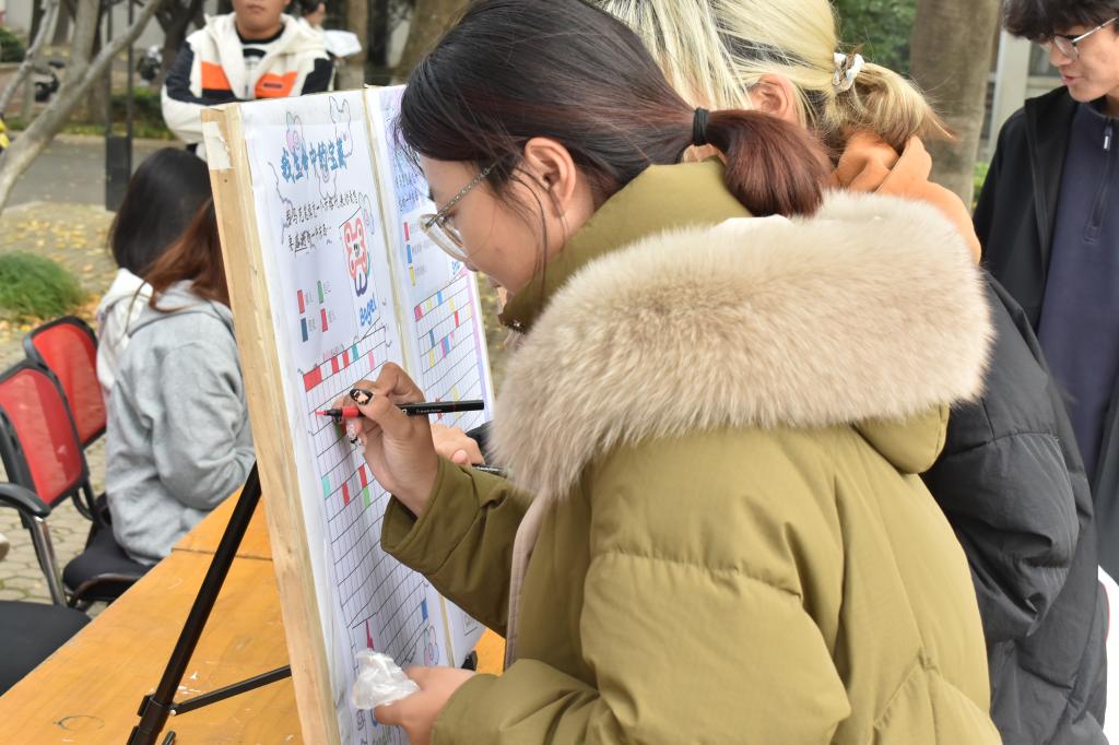 本次活动以画板绘画为主,现场设置大型主题画板,清晰划分了四个情感主题区域。每个区域设有3-4个具体的情感选项,参与学生根据个人感受来选择代表不同情感色彩的马克笔,在画板对应区域进行填涂,完成属于自己的“情绪涂鸦”。除此之外,现场还设置了互动环节,同学们欣赏不同参与者的作品并进行留言,直观感受群体情感的共鸣,以促进彼此之间的交流,深刻体会个人与集体的联结,有效打破了人际隔阂,营造了共情、温暖的校园氛围。