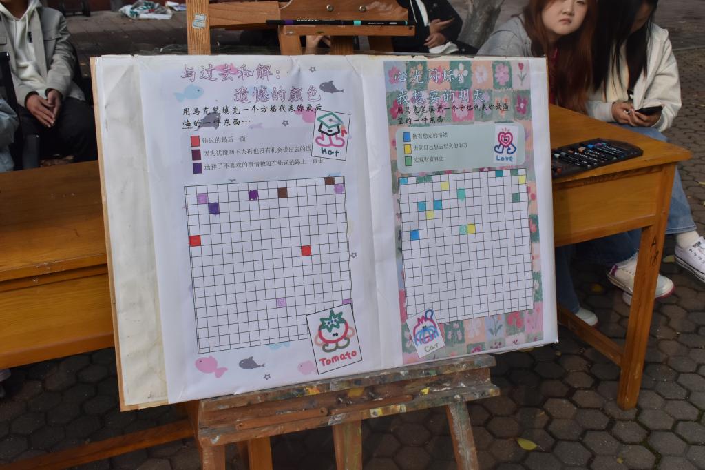 为丰富校园文化生活,关注学生心理健康,搭建一个促进学生自我觉察与情感交流的公共平台,beat365英国官方网站心健联于10月26日在繁星广场举办以“绘色心声,共情共鸣”为主题的心理活动。本次活动旨在借助非语言的创造性表达,引导学生关注内心世界,从而促进个人的情绪疗愈。