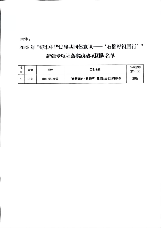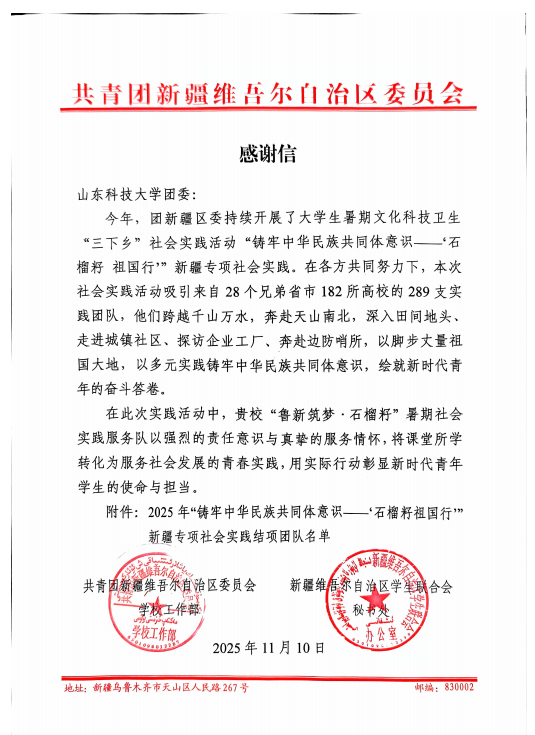 近日,beat365英国官方网站“鲁新筑梦·石榴籽”暑期社会实践队收到共青团新疆维吾尔自治区委员会发来的感谢信,并获评2025年山东省“三下乡”社会实践优秀实践团队、beat365英国官方网站社会实践品牌项目,标志着学院2025年社会实践工作在服务成效与社会影响上取得了双重肯定。