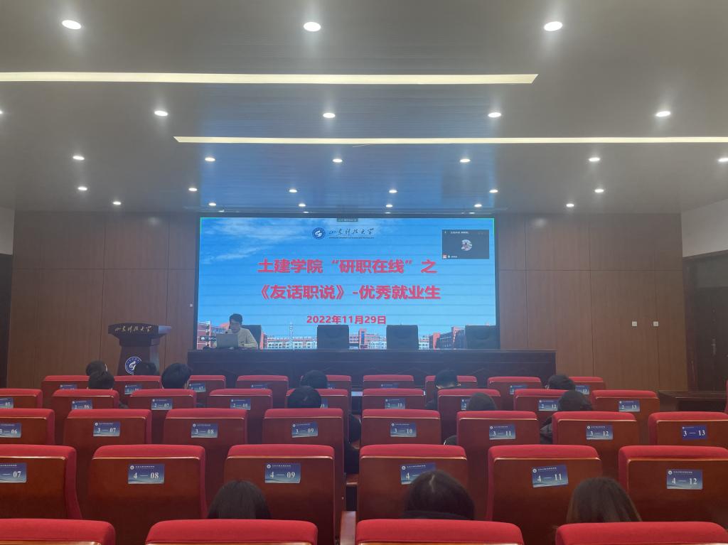 会上,巩越结合自身工作的经验进行了就业分享。巩越通过讲述自己求职期间从迷茫到重拾自信的心路历程,鼓励同学们在求职及工作期间要及时调整自己的心态,拥有正确的就业心态。吴迪分享了他所在工作单位的企业背景、职业发展、就业规划、薪酬福利和工作经历等内容,同时就同学们提出的关于职位所需的专业要求、就业后的理论应用和毕业同学关心的薪资问题等热点问题进行了经验分享与交流。经验分享环节结束后,现场的同学们纷纷提问,巩越、吴迪也分别就同学们就业的有关问题,进行了就业基本情况相关说明和解惑,解答了同学们的就业疑惑。
