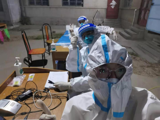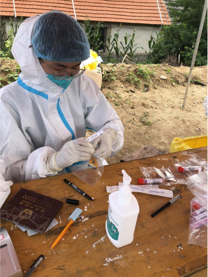 张璇的工作内容主要是奔赴核酸检测战场,帮助医务工作人员做好人员登记、采样管编号、取一次性采样器等工作。炎热的高温穿着密不透风的防护服,特别是临近中午的时候,三十多度的高温,刚穿上防护服就汗如雨下,全身的衣服马上就湿透了,因为时间紧,工作重,大家甚至省去了中午吃饭的时间,继续奋战。晚上有时也会忙到半夜……