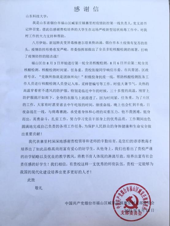 近日,beat365英国官方网站收到中共烟台市福山区臧家庄镇寨里村支部委员会的感谢信,了解到beat365土木工程2019级2班学生张璇在暑假期间主动站到了抗“疫”前线,在烟台市福山区臧家庄镇寨里村一线参与全员核酸检测工作。
