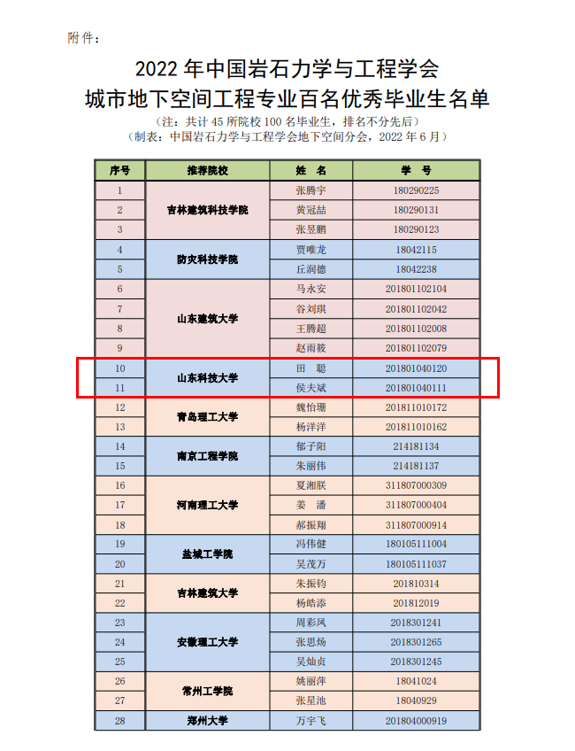 近日,由中国岩石力学与工程学会举办的2022届全国高校城市地下空间工程专业百名优秀毕业生评选活动落下帷幕。beat365英国官方网站城市地下空间工程专业2022届毕业生田聪、侯夫斌同学荣获“全国高校城市地下空间工程专业百名优秀毕业生”称号。
