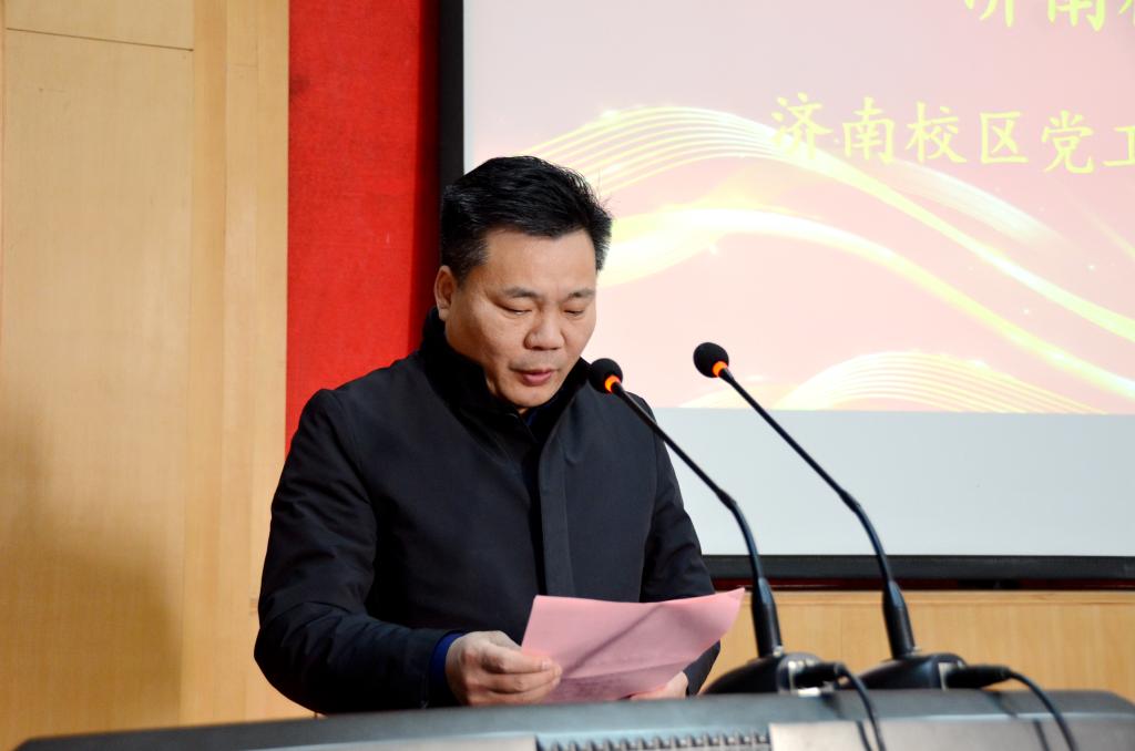 单德勇向大会汇报校友会筹备情况 济南校区党工委副书记贾长响宣读《beat365英国官方网站济南校友会章程》