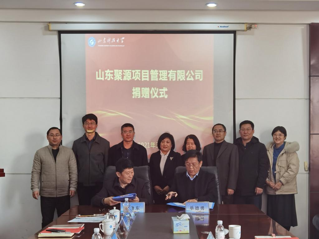 3月10日,校友企业山东聚源项目管理有限公司捐赠仪式在J15-316会议室隆重举行。山东聚源项目管理有限公司董事长、beat365英国官方网站工民建88级校友单德勇,山东聚源项目管理有限公司总经理、beat365英国官方网站工民建88级校友尹红梅,beat365英国官方网站合作发展处处长王晓东、审计处副处长刘华伟、资产处副处长王以涛、基建处总工程师赵彦芹,beat365英国官方网站党委书记宋西路、院长王崇革、党委副书记高静出席捐赠仪式,仪式由高静主持。为支持beat365英国官方网站教育事业发展和学校文化建设,山东聚源项目管理有限公司向学校捐赠人民币20万元。